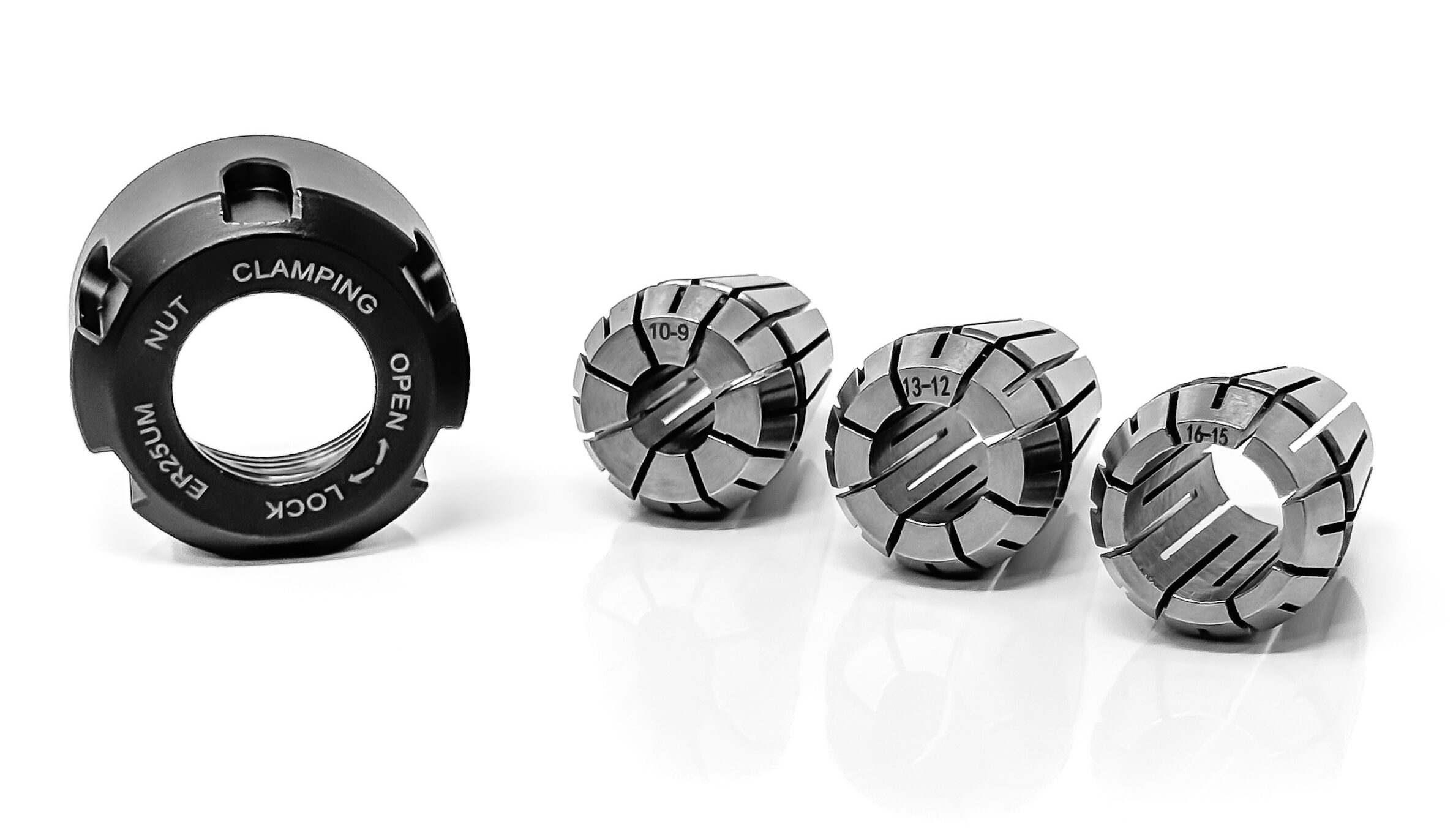- One clamping ER25UM nut to lock the collet and tool into place