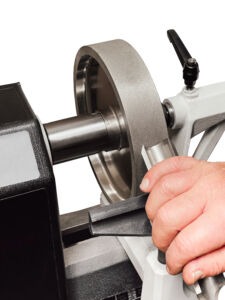 - Turn on your lathe to SLOW speed and carefully begin sharpening your turning tools.